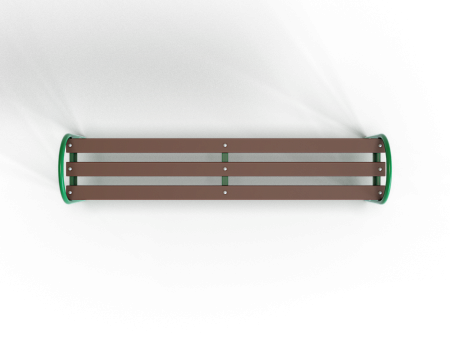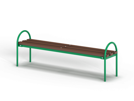 Лавочка изготовлена из металлического сборного каркаса с дугообразными подлокотниками и бруса из древесно-полимерного композита (ДПК).