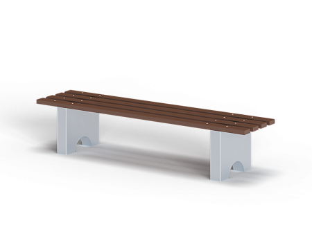 Лавочка выполнена из двух бетонных ножек и деревянного бруса.