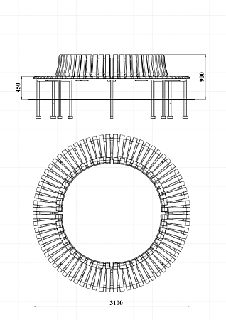 Лавочка - разборная конструкция в форме круга, состоит из металлических ножек, металлического каркаса сидения, металлического каркаса спинки и деревянного бруса. Ножки, сидения и спинки крепятся друг другу через болтовые соединения.