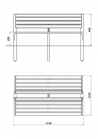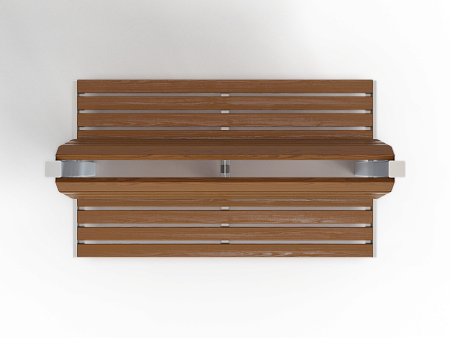 Двухсторонняя лавочка со спинкой (последний брус спинки расположен в позиции подголовника) изготовлена из металлических ножек и бруса из древесно-полимерного композита (ДПК)