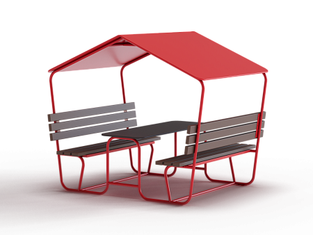 Столик с навесом состоит из сборного металокаркаса, сидений и спинок из древесно-полимерного композита (ДПК), столешницы и навеса из фанеры.