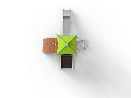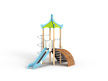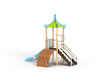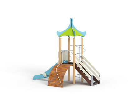 Детский игровой комплекс состоит из одной башни с крышей, лестницей, горкой, трапом-барабаном с перекладиной и канатом, ручками и шестом-спиралью.