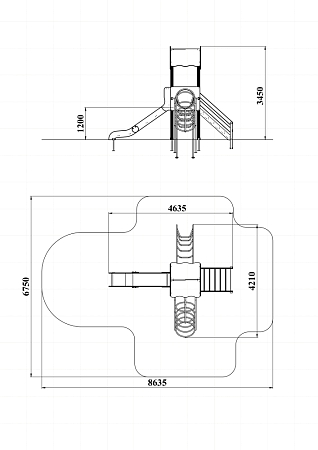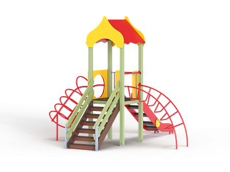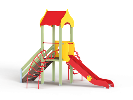 Детский игровой комплекс состоит из одной башни с крышей, лестницей, горкой, лианой и спиралью наклонной.