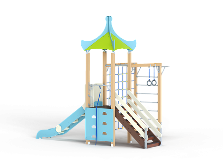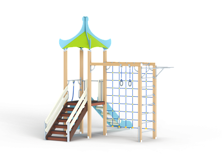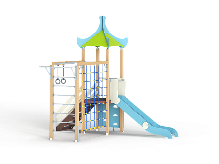 Детский игровой комплекс состоит из одной башни с продолжением в виде гимнастического комплекса. На башне установлена крыша, лестница, горка, альпинистская стенка с перекладиной и канатом. Гимнастический комплекс состоит из рукохода, шведской стенки, турника, гимнастических колец и полипропиленовой сетки.