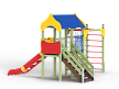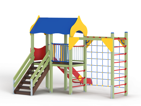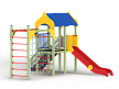 Детский игровой комплекс состоит из башни с крышей, шведской стенкой, ограждениями фанерным и металлическим , огражддением из бруса с перекладинами, горкой и лестницей. К башне присоединен гимнастический комплекс с рукоходом, полипропиленовой сеткой и шведской стенкой.