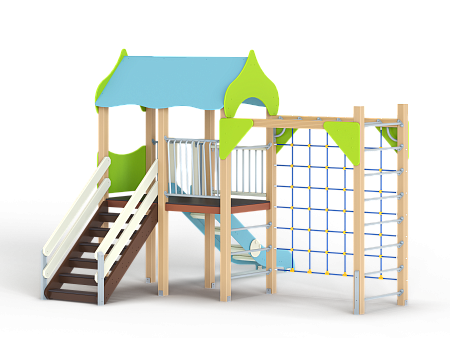Детский игровой комплекс состоит из башни с крышей, шведской стенкой, ограждениями фанерным и металлическим , огражддением из бруса с перекладинами, горкой и лестницей. К башне присоединен гимнастический комплекс с рукоходом, полипропиленовой сеткой и шведской стенкой.