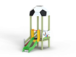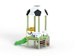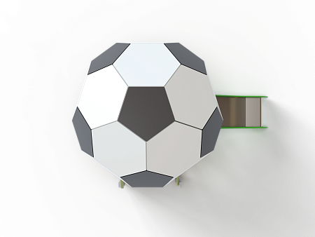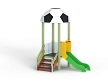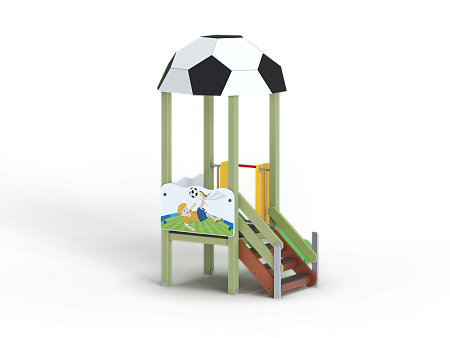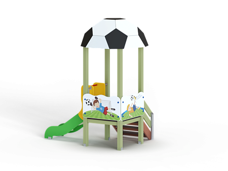 Детский игровой комплекс стилизован в футбольной тематике, состоит из одной башни с крышей в виде половины футбольного мяча, лестницы, горки, фанерных ограждений с художественно оформленной поверхностью.