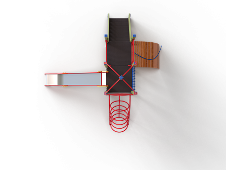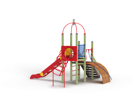 Детский игровой комплекс состоит из двух разновысоких башен. На одной из башен установлена металлическая крыша, спираль наклонная, горка, металлическое ограждение, на другой башне установлен трап барабан с перекладиной и канатом, шведская стенка, ручки и лестница.