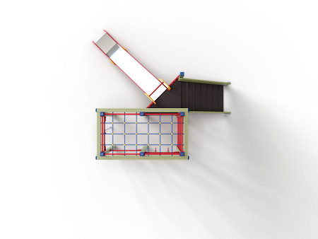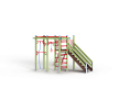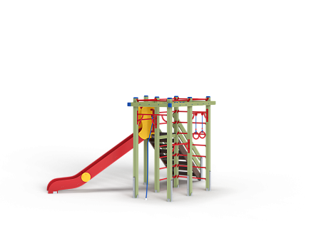 Детский игровой комплекс состоит из треугольной башни и гимнастического комплекса. На башне установлена лестница, горка, металлическое ограждение и шведская стенка. На гимнастическом ком-плексе установлены перекладины, перекладины усиленные, перекладина с канатом, перекладина с кольцами, шведская стенка и сетка полипропиленовая.