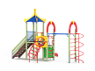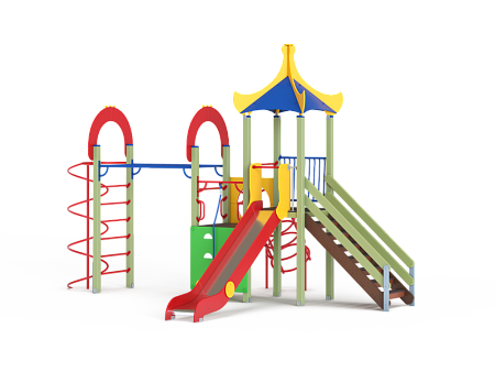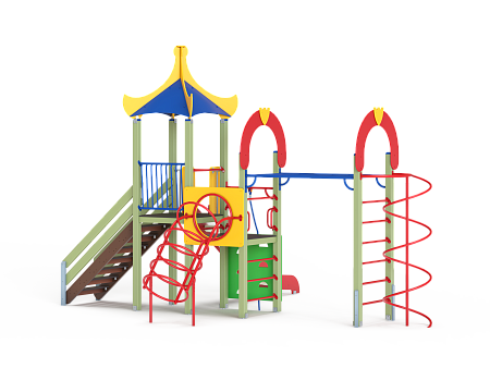 Детский игровой комплекс состоит из двух разновысоких башен. На одной из башен установлены крыша, лестница, горка, металлическое ограждение, на другой башне установлены альпинистская стенка, перекладина с канатом, ручки, спираль наклонная, ограждение с лазом. Одна из башен имеет продолжение в виде гимнастического комплекса который состоит из рукохода, шведской стенки, шеста-спирали и двух фанерных арок.