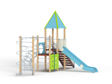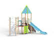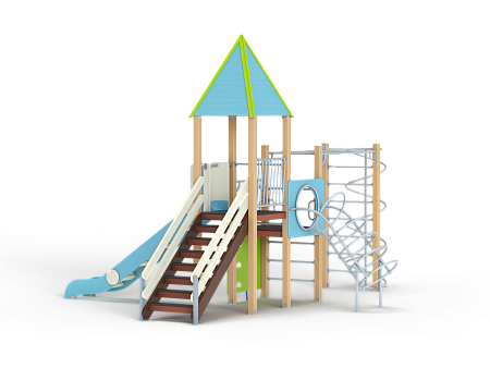 Детский игровой комплекс состоит из двух разновысоких башен. На одной из башен установлены крыша в форме пирамиды, лестница, горка, металлическое ограждение, на другой башне установлены альпинистская стенка, перекладина с канатом, спираль наклонная, ограждение с лазом. Одна из башен имеет продолжение в виде гимнастического комплекса,который состоит из рукохода, шведской стенки и шеста-спирали.