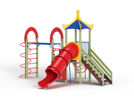 Детский игровой комплекс состоит из двух разновысоких башен. На одной из башен установлены крыша, лестница, горка-труба пластиковая, металлическое ограждение, на другой башне установлены альпинистская стенка, перекладина с канатом, ручки, спираль наклонная, ограждение с лазом. Одна из башен имеет продолжение в виде гимнастического комплекса который состоит из рукохода, шведской стенки, шеста-спирали и фанерных арок.