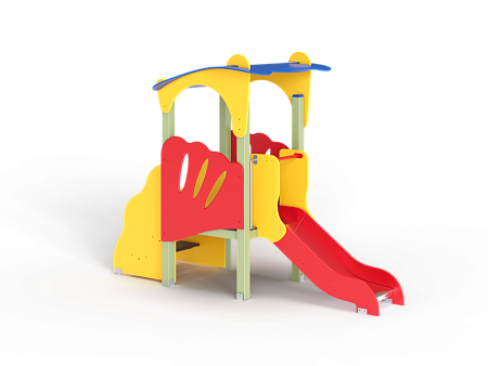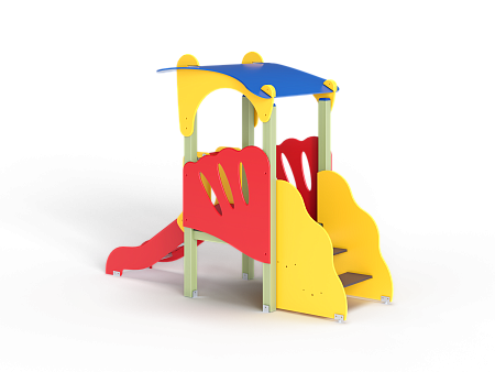 Детский игровой комплекс состоит из одной башни с горкой, фасонными фанерными крышей, лестницей и ограждениями.