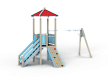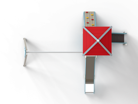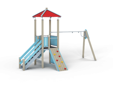Детский игровой комплекс состоит из башни с качелями. На башне установлены крыша четырехскатная, пять ограждений из бруса, трап из бруса с альпинистскими камнями, лестница, горка и примыкающие к ней качели на деревянных столбах.