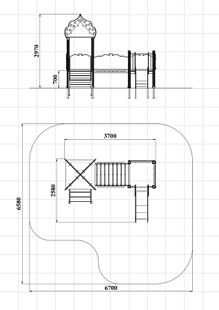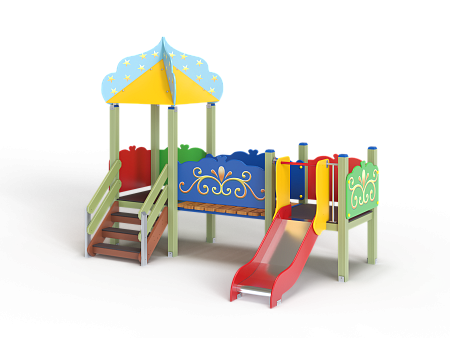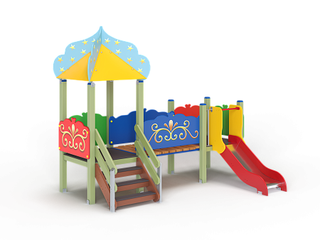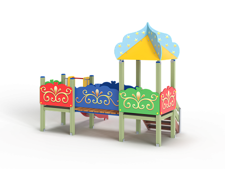 Детский игровой комплекс с художественным оформлением в восточном стиле, состоит из двух башен соединенных прямым мостом с фанерными ограждениями. На первой башне установлена крыша, два фанерных ограждения и лестница. На второй башне установлены ограждения фанерные и горка.