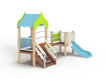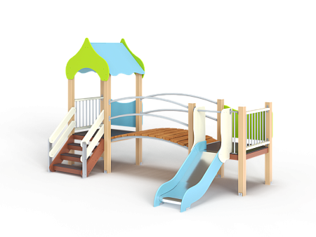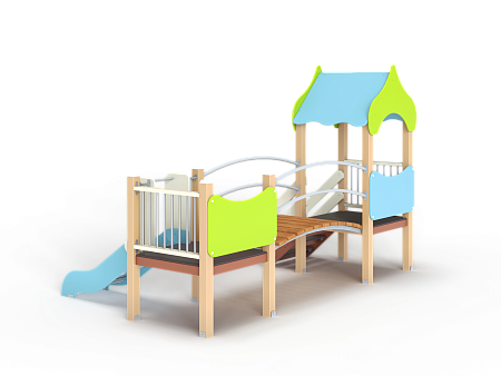 Детский игровой комплекс состоит из двух башен соединенных радиусным мостом с металлическими перилами. На первой башне установлена крыша,фанерное ограждение, ограждение из бруса с перекладинами и лестница. На второй башне установлена горка, фанерное ограждение и ограждение из бруса с перекладинами.