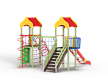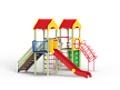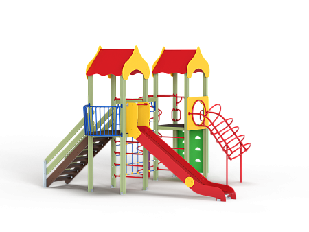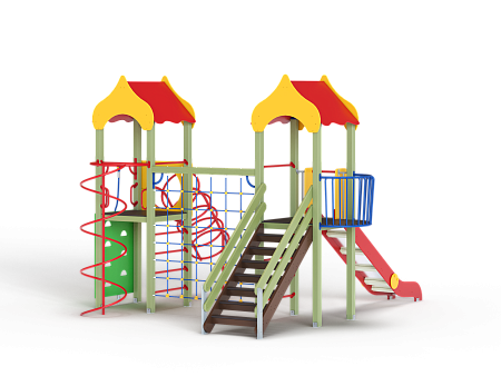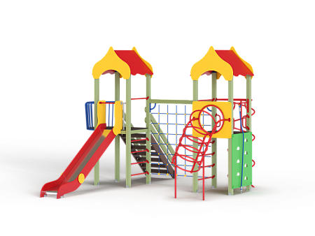 Детский игровой комплекс состоит из двух башен с крышами. На одной из башен установлена лестница, горка, балкон, шведская стенка. На другой башне установлены альпинистская стенка, перекладина с канатом, шест спираль, шведская стенка, ограждение с полукруглым вырезом, спираль наклонная и ручки вспомогательные. Башни соединены полипропиленовой сеткой и столбом