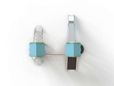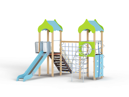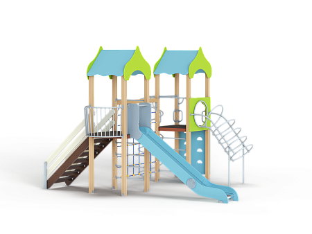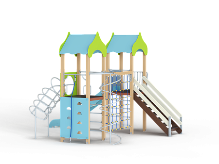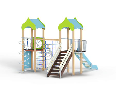 Детский игровой комплекс состоит из двух башен с крышами. На одной из башен установлена лестница, горка, балкон, шведская стенка. На другой башне установлены альпинистская стенка, перекладина с канатом, шест спираль, шведская стенка, ограждение с полукруглым вырезом, спираль наклонная и ручки вспомогательные. Башни соединены полипропиленовой сеткой и столбом