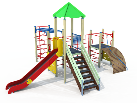 Детский игровой комплекс состоит из двух башен с крышами. На одной из башен установлена лестница, горка, балкон, шведская стенка. На другой башне установлены альпинистская стенка, перекладина с канатом, шест спираль, шведская стенка, ограждение с полукруглым вырезом, спираль наклонная и ручки вспомогательные. Башни соединены полипропиленовой сеткой и столбом
