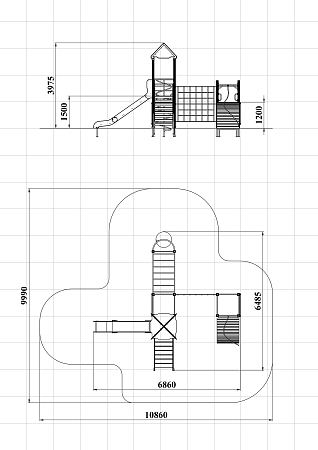 Детский игровой комплекс состоит из двух башен с крышами. На одной из башен установлена лестница, горка, балкон, шведская стенка. На другой башне установлены альпинистская стенка, перекладина с канатом, шест спираль, шведская стенка, ограждение с полукруглым вырезом, спираль наклонная и ручки вспомогательные. Башни соединены полипропиленовой сеткой и столбом