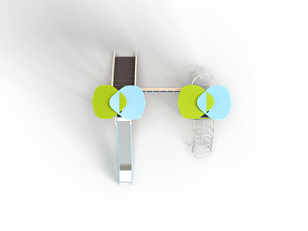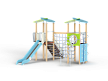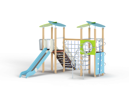 Детский игровой комплекс состоит из двух башен с крышами. На одной из башен установлены лестница, горка, балкон и шведская стенка. На другой башне установлены альпинистская стенка, перекладина с канатом, шест-спираль, шведская стенка, ручки, ограждение с круглым вырезом и спираль наклонная. Башни соединены полипропиленовой сеткой и столбом.