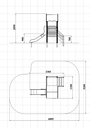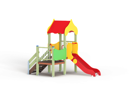 Детский игровой комплекс состоит из двух разновысоких башен. На одной башне установлены фанерная крыша, горка, вспомогательные ручки, фанерное ограждение и ограждение из бруса с перекладинами. На второй башне установлена лестница, фанерное ограждение и ограждение из бруса с перекладинами.