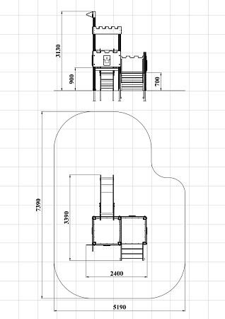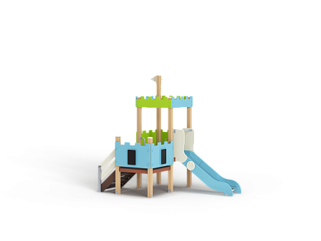 Детский игровой комплекс состоит из двух разновысоких башен. На одной из башен установлена фанерная крыша, декоративные фанерные флажки, горка, вспомогательные ручки, фанерные ограждения, на другой башне установлена лестница и фанерные ограждения.