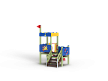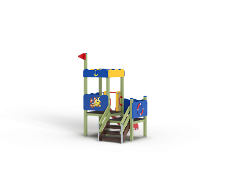 Детский игровой комплекс состоит из двух разновысоких башен. На одной из башен установлена фанерная крыша, декоративные фанерные флажки, горка, вспомогательные ручки, фанерные ограждения с художественно оформленной поверхностью в морской тематике, на другой башне установлена лестница и фанерные ограждения с художественно оформленной поверхностью в морской тематике.
