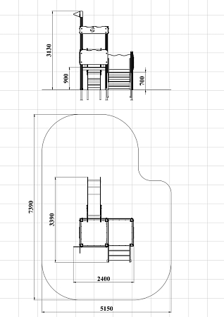 Детский игровой комплекс состоит из двух разновысоких башен. На одной из башен установлена фанерная крыша, декоративные фанерные флажки, горка, вспомогательные ручки, фанерные ограждения с художественно оформленной поверхностью в морской тематике, на другой башне установлена лестница и фанерные ограждения с художественно оформленной поверхностью в морской тематике.