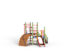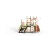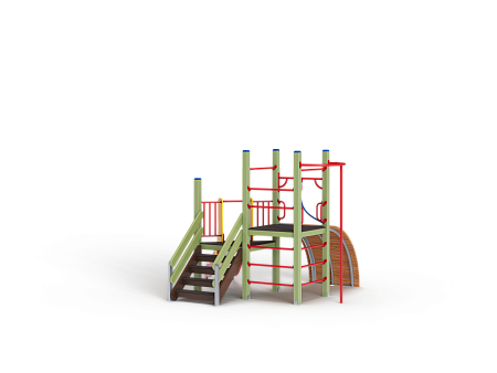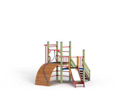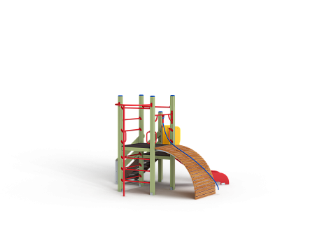 Детский игровой комплекс состоит из двух разновысоких башен. На одной из башен установлена лестница, горка, металлическое ограждение, на другой башне установлены трап-барабан с перекладиной и канатом, шест, две шведские стенки и ручки вспомогательные.