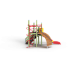 Детский игровой комплекс состоит из двух разновысоких башен. На одной из башен установлена лестница, горка, металлическое ограждение, на другой башне установлены трап барабан с перекладиной и канатом, шест спираль, две шведские стенки и ручки вспомогательные.