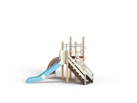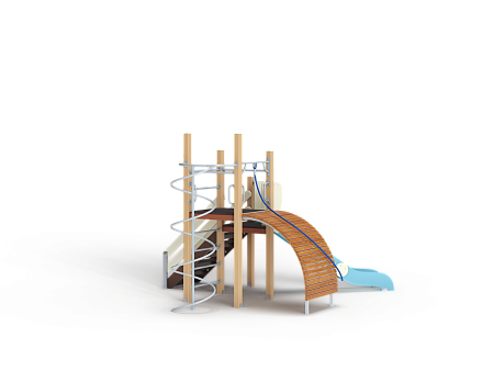 Детский игровой комплекс состоит из двух разновысоких башен. На одной из башен установлена лестница, горка, металлическое ограждение, на другой башне установлены трап барабан с перекладиной и канатом, шест спираль, две шведские стенки и ручки вспомогательные.
