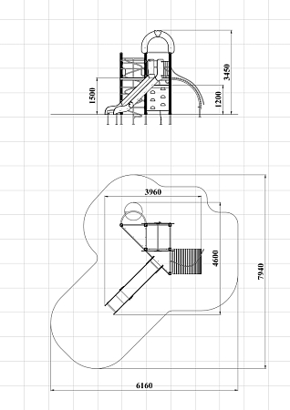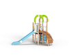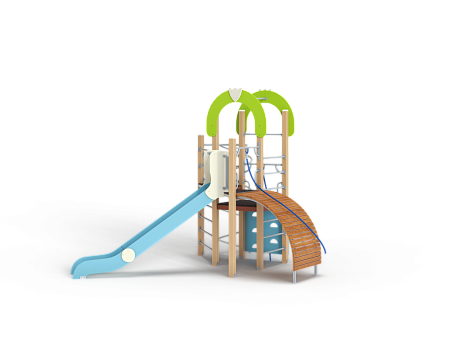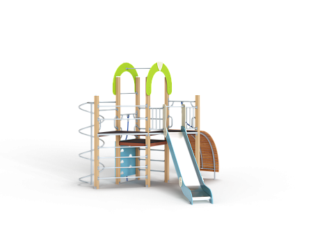 Детский игровой комплекс состоит из трёх башен. На одной из башен установлены трап-барабан с перекладиной и канатом, горка, металлическое ограждение, ручки вспомогательные, на второй башне установлены, шест спираль, шведская стенка и ручки вспомогательные, на третьей башне установлены альпинистская стенка, перекладина с канатом, ручки вспомогательные, шведская стенка, декоративные фанерные арки.