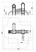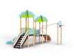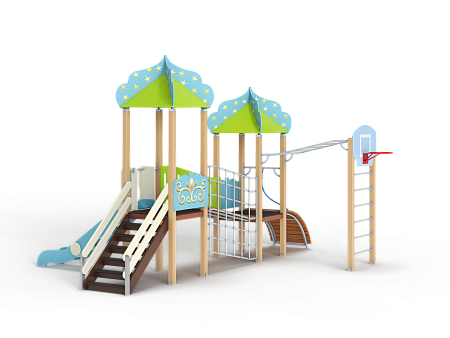 Детский игровой комплекс состоит из двух башен с крышами. На первой башне установлена лестни-ца, горка и фанерное ограждение. На второй башне установлены трап барабан с перекладиной и канатом и фанерное ограждение. Башни соеди-нены между собой разновысоким мостом, с одной стороны которого установлено фанерное огражде-ние, а с другой стороны сетка металлическая. Вто-рая башня имеет продолжение в виде вынесенной шведской стенки с баскетбольным щитом, соеди-няются металлическим рукоходом