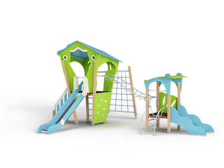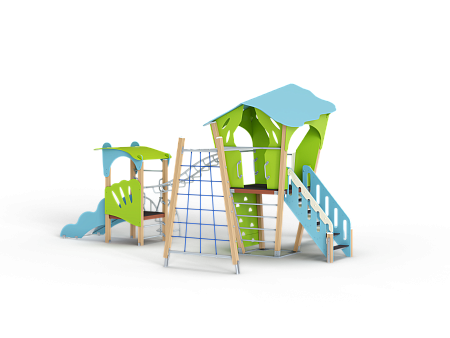 Детский игровой комплекс состоит из двух башен. На одной из башен установлена лестница, горка, альпинистская стенка, ограждение, ручки вспомогательные и внешняя сетка полипропиленовая, соединенная с башней рукоходом. На другой башне установлены трап, лиана, шведская стенка, ручки вспомогательные и ограждение. Башни соединены между собой металлическим рукоходом.