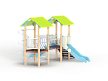 Детский игровой комплекс состоит из двух башен. На одной из башен установлена лестница, две горки и крыша, на другой башне установлены турник, шест спираль, шведская стенка, ручки вспомогательные и ограждение из бруса с перекладинами Башни соединены между собой канатным мостом.