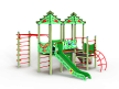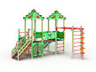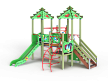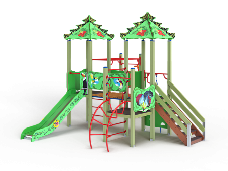 Детский игровой комплекс художественным оформлением в стиле “Райских птиц”. Комплекс состоит из двух башен с вынесенной шведской стенкой. На первой башне установлена крыша, альпинистская стенка с перекладиной и канатом, лестница, и примыкающая к нему полубашня с шведской стенкой, лианой, ручками вспомогательными и ограждением фанерным. На второй башне установлена горка, крыша, ручки вспомогательные, шведская стенка и примыкающий к ней рукоход с вынесенной шведской стенкой и шестом с пластиковыми кольцами. Башни соединены прямым мостом с фанерными перилами.