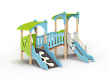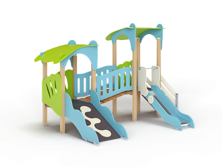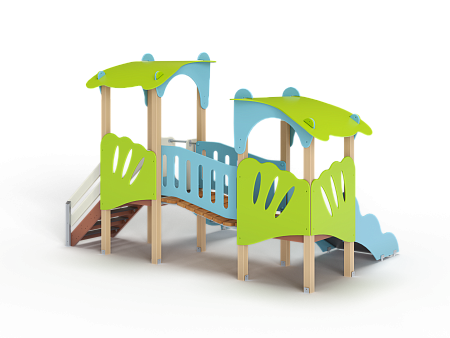 Детский игровой комплекс состоит из двух башен с фасонными крышами, соединенных разновысоким мостом с фанерными перилами. На первой башне установлены лестница, горка и ограждение. На второй башне установлены трап и ограждения.