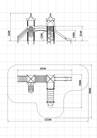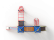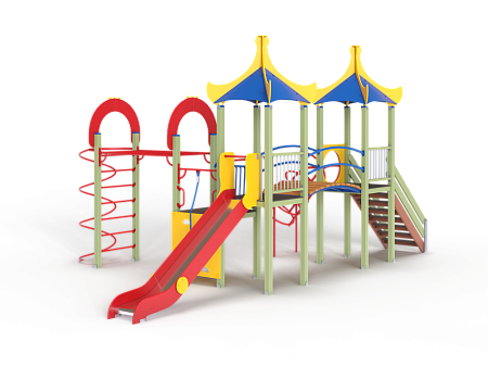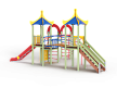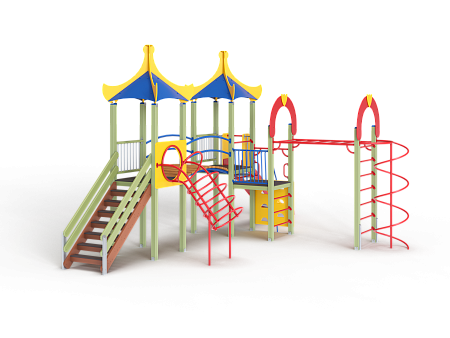 Детский игровой комплекс состоит из двух башен и одной полубашни с вынесенной шведской стенкой. На первой башне с полубашней установлена альпинистская стенка с перекладиной и канатом, ограждение металлическое, четыре вспомогательные ручки, шведская стенка и примыкающий к ней рукоход с вынесенной шведской стенкой, две декоративные арки, со стороны вынесенной шведской стенки установлен шест спираль. На второй башне установлена горка, крыша и ограждение из бруса с перекладинами. На третьей башне установлена крыша, лестница, ограждение из бруса с перекладинами, спираль наклонная. Вторая и третья башня соединены радиусным мостом с металлическими перилами.