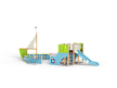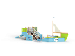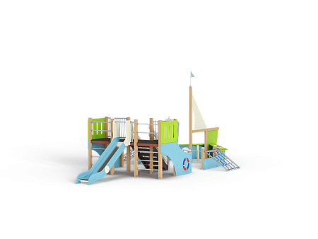 Детский игровой комплекс скомпонован в форме корабля. На кормовой части установлена площадка с горкой, лестница, балкон, шведские стенки, ограждения металлические и фанерные. По периметру расположены фанерные ограждения с декоративными накладками, две сетки полипропиленовые, две металлические стяжки, мачта с фанерным парусом и металлическим флагом.