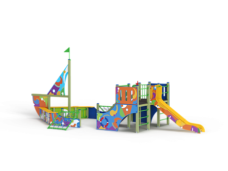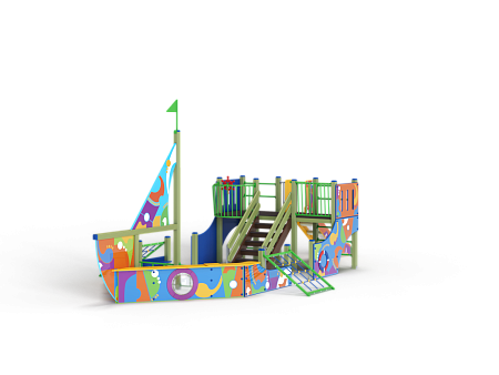 Детский игровой комплекс скомпонован в форме корабля с художественным оформлением в стиле графити. На кормовой части установлена площадка с горкой, лестница, балкон, шведские стенки, ограждения металлические и фанерные. По периметру расположены фанерные ограждения с декоративными накладками, две сетки полипропиленовые, две металлические стяжки, мачта с фанерным парусом и металлическим флагом.