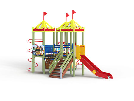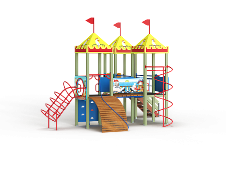 Детский игровой комплекс состоит из трёх башен с крышами. Комплекс имеет художественное оформление в стиле пиратов. На первой башне установлена альпинистская стенка с перекладиной и канатом, спираль наклонная, ограждение с вырезом, трап барабан с перекладиной и канатом, ручки вспомогательные. На второй башне установлены шест спираль, перекладина, ограждение фанерное, ручки вспомогательные. На третьей башне установлена лестница, горка и ограждение. Первая и вторая башни соединены прямым мостом с фанерными перилами, вторая и третья соединены подвесным мостом..