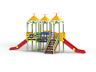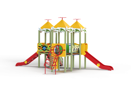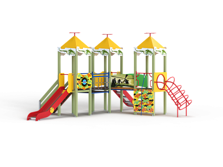 Детский игровой комплекс с художественным оформлением в стиле военного городка, который состоит из трёх башен с крышами. На первой башне установлена альпинистская стенка с перекладиной и канатом, спираль наклонная, ограждение с вырезом, трап барабан с перекладиной и канатом, ручки вспомогательные. На второй башне установлены горка, фанерное ограждение. На третьей башне установлена лестница, горка и фанерное ограждение. Первая и вторая башни соединены прямым мостом с фанерными перилами, вторая и третья соединены подвесным мостом.