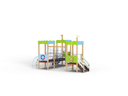 Детский игровой комплекс состоит из трёх башен. На первой башне установлена лестница, декоративные фанерные флажки, шведская стенка и фанерное ограждение с художественной оформленной поверхностью в морской тематике. На второй башне установлена лиана и фанерное ограждение с художественной оформленной поверхностью в морской тематике. На третьей башне установлена горка, лестница, декоративные фанерные флажки, шведская стенка и фанерное ограждение с художественной оформленной поверхностью в морской тематике. Третья и вторая башни соединены сеткой полипропиленовой, вторая и первая соединены подвесным мостом.