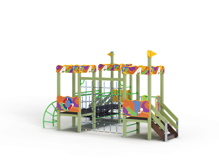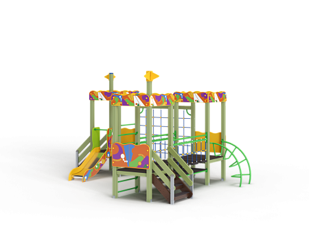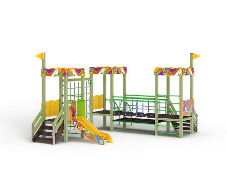Детский игровой комплекс состоит из трёх башен с художественным оформлением в стиле граффити. На первой башне установлена лестница, декоративные фанерные флажки, шведская стенка и фанерное ограждение. На второй башне установлена лиана и фанерное ограждение. На третьей башне установлена горка, лестница, декоративные фанерные флажки, шведская стенка и фанерное ограждение. Третья и вторая башни соединены сеткой полипропиленовой, вторая и первая соединены подвесным мостом.