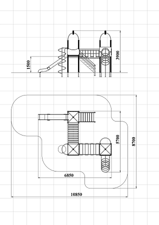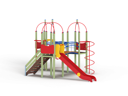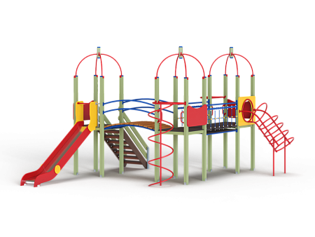 Детский игровой комплекс состоит из трёх башен с металлическими крышами. На первой башне установлена лестница, горка, фанерное ограждение и она соединяется со второй радиусным мостом с металлическими перилами. На второй башне установлено фанерное ограждение, шест спираль и она соединяется подвесным качающимся мостом с третьей башней. На третьей башне установлена спираль наклонная, шест и фанерное ограждение.