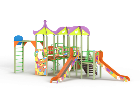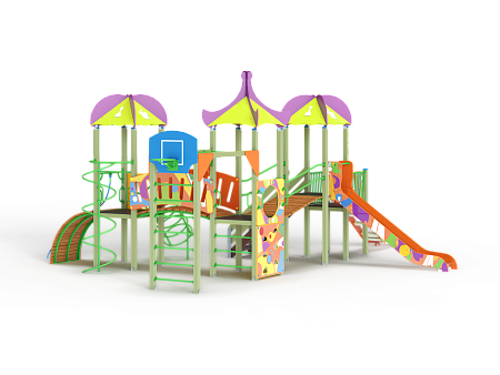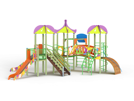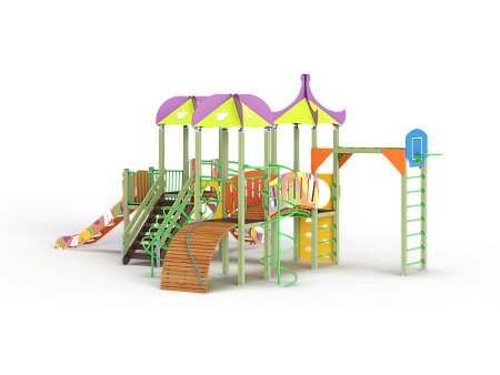 Детский игровой комплекс состоит из трёх башен с металлическими крышами, имеет художественное оформление в стиле граффити. На первой башне с полубашней установлены лестница, две горки, ограждения металлические и соединяется со второй башней разновысоким мостом с металлическими перилами. На второй башне установлены ограждение с круглым вырезом, альпинистская стенка, ручки вспомогательные, шведская стенка, внешний гимнастический комплекс с баскетбольным щитом и кольцом. Вторая башня соединяется с третьей радиусным мостом с фанерными перилами. На третьей башне установлена спираль наклонная, шест-спираль, ручки вспомогательные и трап барабан с перекладиной и канатом.