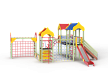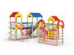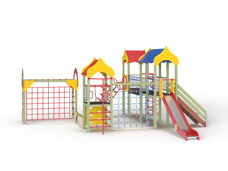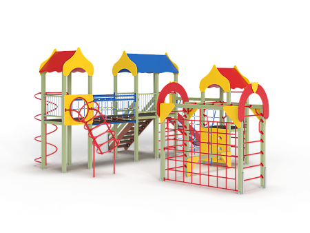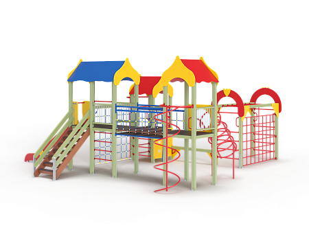 Детский игровой комплекс состоит из трёх башен с крышами. На первой башне установлена альпинистская стенка с перекладиной и канатом, швед-ская стенка, шест, ограждение и ручки вспомога-тельные. На второй башне установлены горка, ограждения, лестница, шведская стенка. На треть-ей башне установлены спираль наклонная, ограж-дение, шест спираль, ручки вспомогательные и пе-рекладина. Первая и вторая башни соединены сет-кой полипропиленовой, вторая и третья соедине-ны подвесным мостом. К первой башне присоеди-нен с помощью бум бревна гимнастический ком-плекс с рукоходом, сеткой металлической, двумя шведскими стенками и декоративными арками
