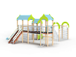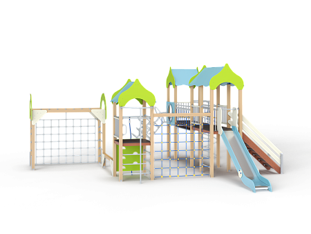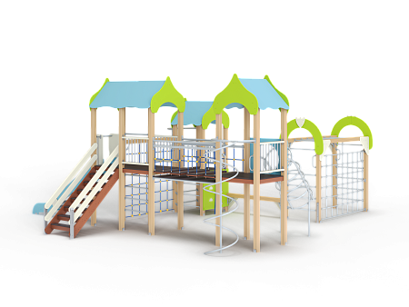 Детский игровой комплекс состоит из трёх башен с крышами. На первой башне установлена альпинистская стенка с перекладиной и канатом, швед-ская стенка, шест, ограждение и ручки вспомога-тельные. На второй башне установлены горка, ограждения, лестница, шведская стенка. На треть-ей башне установлены спираль наклонная, ограж-дение, шест спираль, ручки вспомогательные и пе-рекладина. Первая и вторая башни соединены сет-кой полипропиленовой, вторая и третья соедине-ны подвесным мостом. К первой башне присоеди-нен с помощью бум бревна гимнастический ком-плекс с рукоходом, сеткой металлической, двумя шведскими стенками и декоративными арками