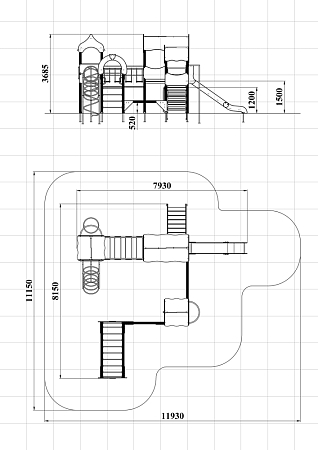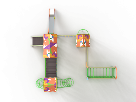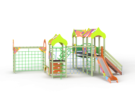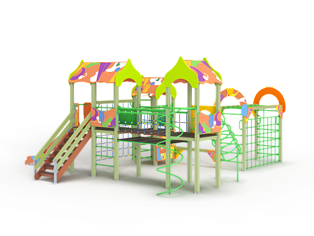 Детский игровой комплекс состоит из трёх башен с крышами, имеет художественное оформление в стиле граффити. На первой башне установлена альпинистская стенка с перекладиной и канатом, шведская стенка, шест, ограждение и ручки вспомогательные. На второй башне установлены горка, ограждения, лестница, шведская стенка. На третьей башне установлены спираль наклонная, ограждение, шест спираль, ручки вспомогательные и перекладина. Первая и вторая башни соединены сеткой полипропиленовой, вторая и третья соединены подвесным качающимся мостом. К первой башне присоединен с помощью бум бревна гимнастический комплекс с рукоходом, сеткой вертикальной металлической, двумя шведскими стенками и декоративными арками.
